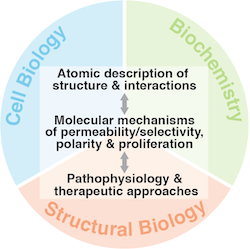 We are bringing together an arsenal of cutting-edge techniques to crack this molecular puzzle. In the lab, we produce and purify TJ proteins in large quantities, allowing us to measure how they interact and function in carefully controlled conditions. We then use leverage powerful electron microscopes and synchrotron X-ray sources at in the Chemistry and Biochemistry Department and the California NanoSystems Institute (CNSI), and national facilities—to elucidate the 3D-structures of these protein assemblies all the way to atomic detail by single particle cryo-electron microscopy (cryo-EM) and X-ray crystallography or reconstruct 3D-shapes of TJs in their native cellular environment by cryo-electron tomography (cryo-ET). To connect our molecular discoveries to living systems, we engineer cells using CRISPR technology to watch and manipulate TJs in action: we measure how TJs control what passes between cells, maintain cellular organization, and regulate tissue growth, while using proteomic tools to track the precise the TJs’ composition and dynamics.