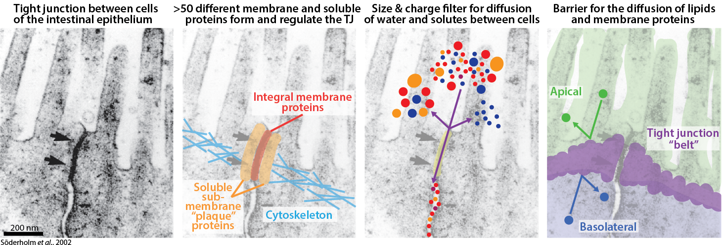 Our bodies are made up of trillions of cells that somehow manage to stick together while carefully controlling what passes between them. This remarkable feat is achieved through specialized structures called tight junctions (TJs)—intricate protein assemblies that act as molecular “zippers” and selective gatekeepers between adjacent cells. But TJs do more than just control traffic of water and solutes—they help cells and tissues polarize in order to tell top from bottom and distinguish inside from outside, and contribute to the monitoring of contacts with neighbors to detect tissue damage or need for expansion. Found primarily in epithelial and endothelial tissues throughout the body, but also in between neuronal axons and the glial cells that insulate them, TJs are essential for maintaining distinct compartments within our organs. We are fascinated by how these microscopic barriers encode what to let through differently in various tissues throughout the body, while also serving as sophisticated cellular sensors that monitor tissue integrity, geometry, and proliferation. How do they do it?